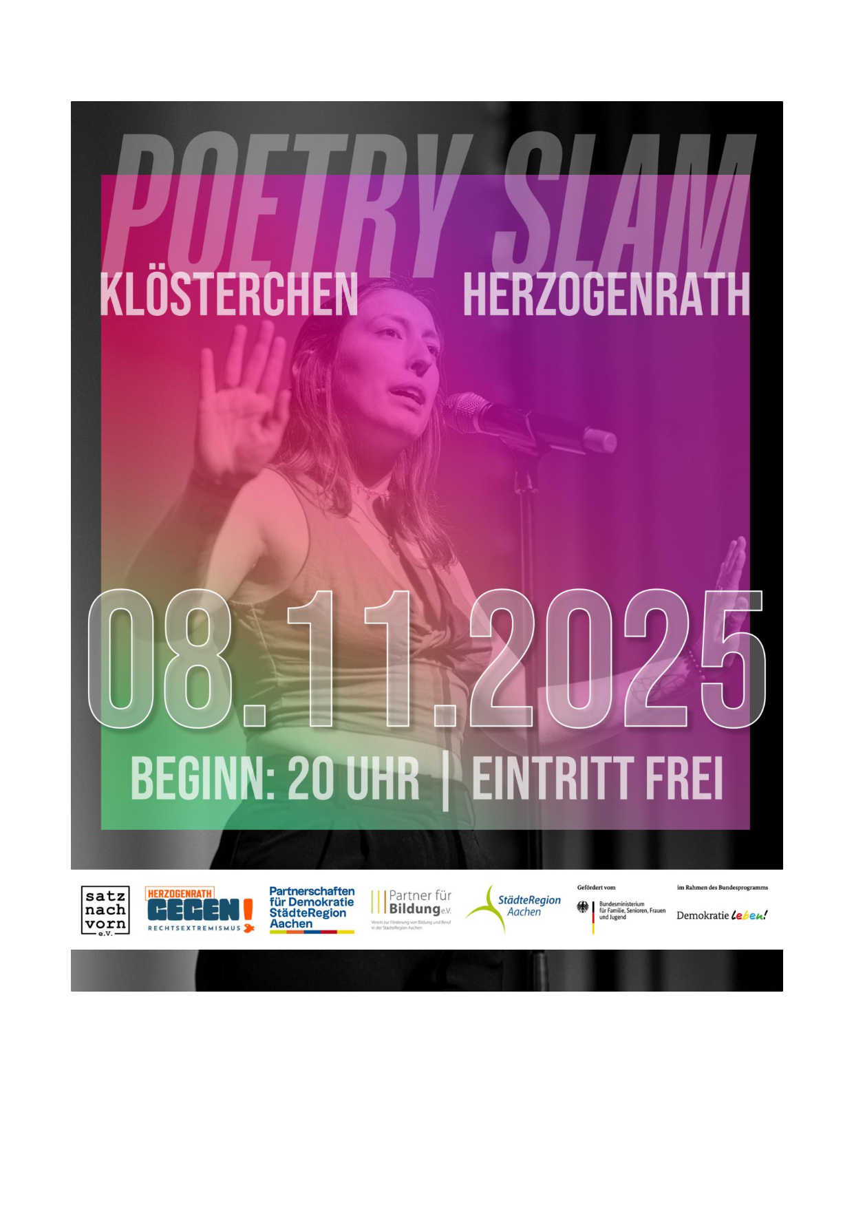 8.11.2025 Poetry Slam im Kösterchen in Herzogenrath Poetry Slam im Klösterchen in Kooperation mit dem Herzogenrather Bündnis gegen Rechtsextremismus, Demokratie leben! und satznachvorn e.V. ......................... Dem literarischen Wettstreit stellen sich: Jouhaina Lahchaichi, René Greschert, Kim Catrin und Malte Küppers. Moderiert wird der Abend von den Aachener Moderatoren Oscar Malinowski und Lukas Knoben. Beginn: 20:00Uhr Eintritt frei Im Klösterchen in 52134 Herzogenrath Soziokultur. Zentrum Klösterchen, Dahlemer Str. 28 Um Anmeldung wird bei der Volkshochschule Nordkreis Aachen gebeten: E-Mail: info@vhs-nordkreis-aachen.de Telefon: 02404 9063 0 Online: https://www.vhs-nordkreis-aachen.de/programm/kurs/Poetry-Slam-im-Kloesterchen/252-10002 ......................... Veranstalter: SJD-Die Falken, OV Merkstein, im Herzogenrather Bündnis gegen Rechtsextremismus www.sjd-die-falken-merkstein.info ......................... Information und Anmeldungen Siehe >>> Flugblatt S.1 Siehe >>> Flugblatt S.2 Siehe >>> PDF-Flugblatt