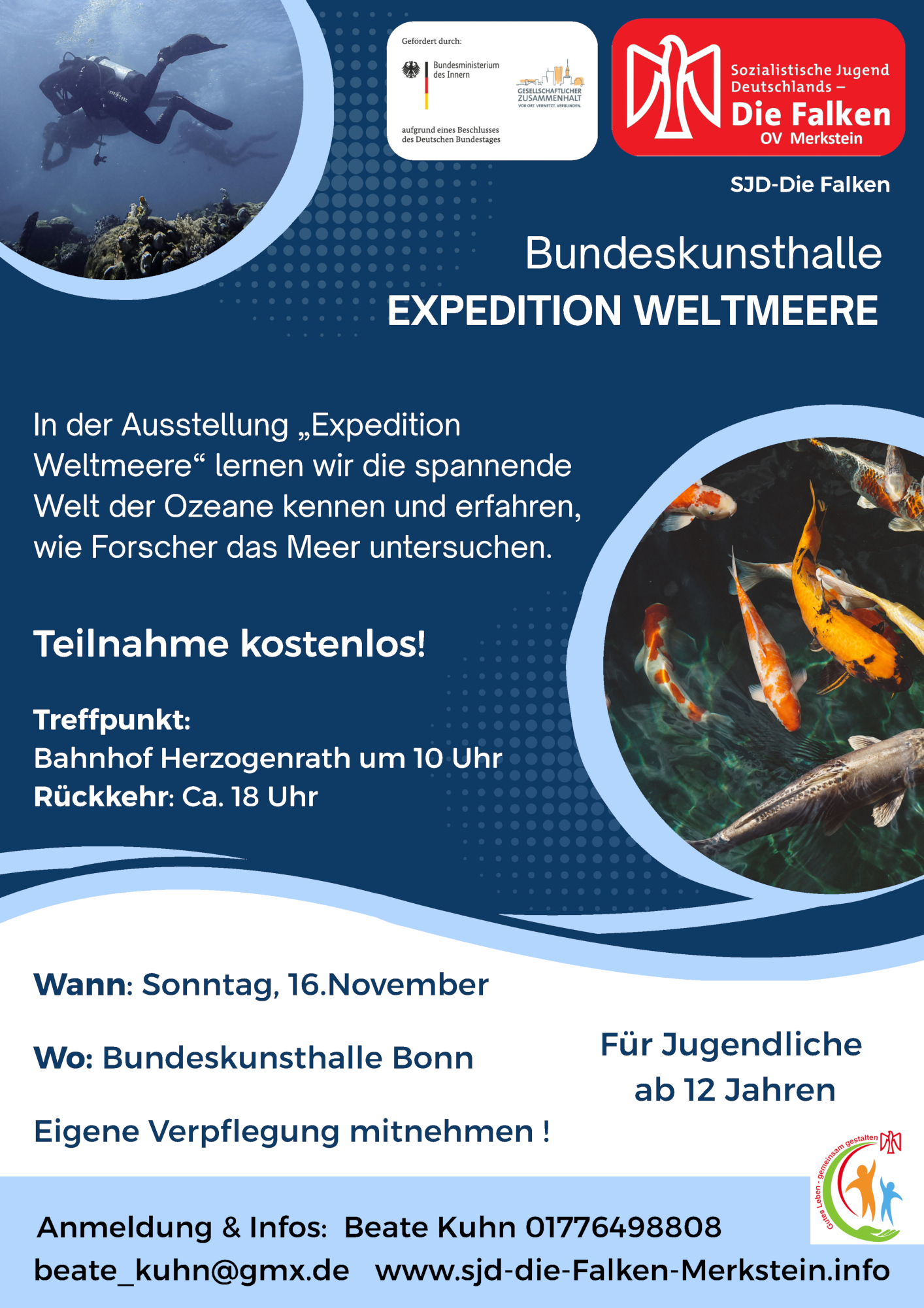 16.11.2025 Bundeskunsthalle - EXPEDITION WELTMEERE Projekt "Gutes Leben - gemeinsam gestalten" Für Jugendliche ab 12 Jahren Treffpunkt: Bahnhof Herzogenrath, Sonntag, 16.11.2025, 10:00Uhr Rückkehr Bahnhof Herzogenrath, ca. 18:00Uhr Teilnahme kostenlos In der Ausstellung „Expedition Weltmeere“ lernen wir die spannende Welt der Ozeane kennen und erfahren, wie Forscher das Meer untersuchen. Wo: Bundeskunsthalle Bonn Wann: Sonntag, 16.November Eigene Verpflegung mitnehmen ! Information und Anmeldung: Beate Kuhn Tel.: 0177 6498808 E-mail: beate_kuhn@gmx.de www.sjd-die-falken-merkstein.info Veranstalter: SJD-Die Falken, OV Merkstein www.sjd-die-falken-merkstein.info Im Rahmen des Projekts "Gutes Leben - gemeinsam gestalten!" Gefördert durch Bundesministerium des Innern und für Heimat Gesellschaftlicher Zusammenhalt vor Ort vernetzt verbunden siehe >>> Flugblatt siehe >>> PDF-Flugblatt