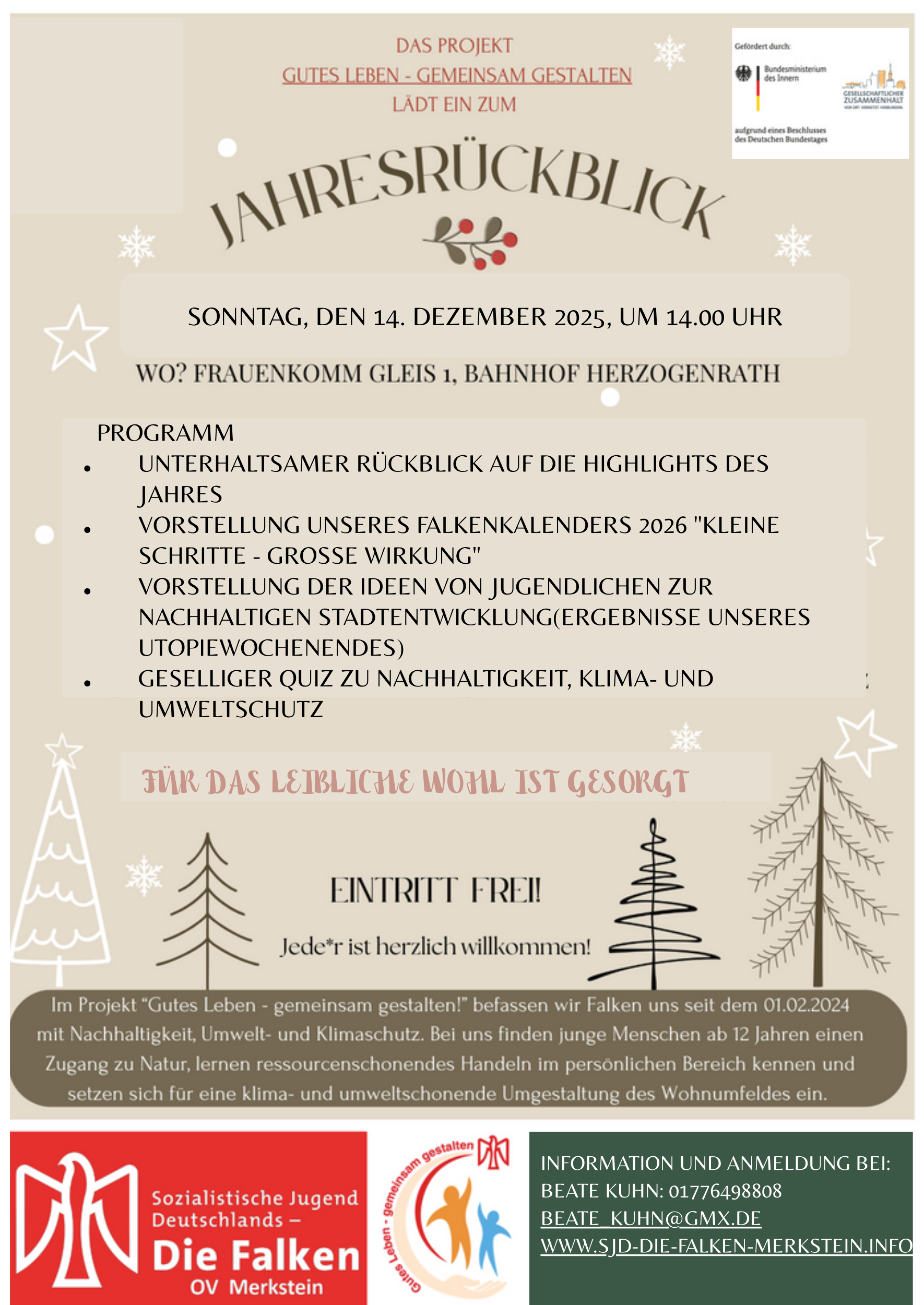 Veranstalter: SJD-Die Falken, OV Merkstein www.sjd-die-falken-merkstein.info DAS PROJEKT "Gutes Leben - gemeinsam gestalten" Das Projekt wird gefördert von Bundesministerium des Innern und für Heimat