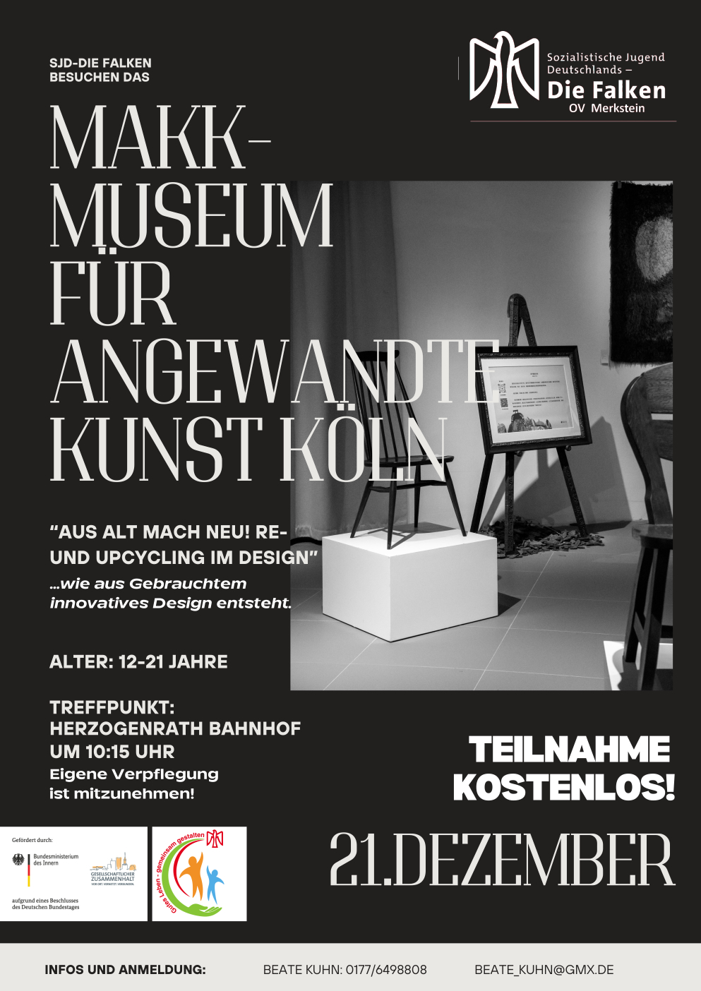 21.12.2025 Makk-Museum für angewandte Kunst Köln Projekt "Gutes Leben - gemeinsam gestalten" Für Jugendliche von 12-21 Jahren Treffpunkt: Bahnhof Herzogenrath, 21.12.2025, 10:15Uhr Teilnahme kostenlos "Aus alt mach neu. Re- und upcycling im Design" ...wie aus Gebrauchtem innovatives Design entsteht Eigene Verpflegung mitnehmen Information und Anmeldung: Beate Kuhn Tel.: 0177 6498808 E-mail: beate_kuhn@gmx.de www.sjd-die-falken-merkstein.info Veranstalter: SJD-Die Falken, OV Merkstein www.sjd-die-falken-merkstein.info Im Rahmen des Projekts "Gutes Leben - gemeinsam gestalten!" Gefördert durch Bundesministerium des Innern und für Heimat Gesellschaftlicher Zusammenhalt vor Ort vernetzt verbunden siehe >>> Flugblatt siehe >>> PDF-Flugblatt